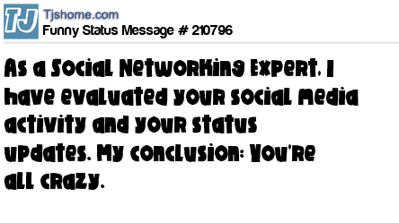 X says As a Social Networking Expert, I have evaluated your social media activity and your status updates. My conclusion: You're all crazy.