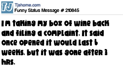 X says I’m taking my box of wine back and filing a complaint. It said once opened it would last 6 weeks, but it was gone after 3 hrs.