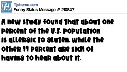 X says A new study found that about one percent of the U.S. population is allergic to gluten, while the other 99 percent are sick of having to hear about it.