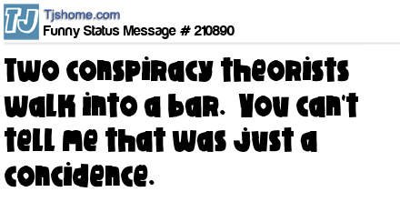 X says Two conspiracy theorists walk into a bar. You can't tell me that was just a concidence.