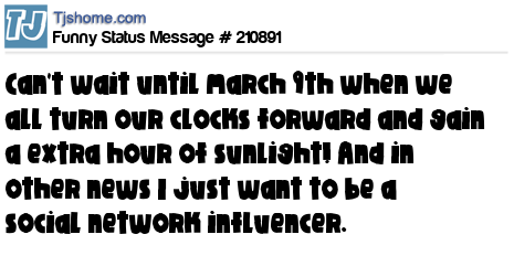 - # 210892 Can't wait until November 2nd when we all turn our clocks forward and gain a extra hour of sunlight! And in other news I just want to be a social network influencer.