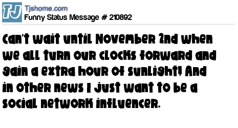 - # 210891 Can't wait until march 9th when we all turn our clocks forward and gain a extra hour of sunlight! And in other news I just want to be a social network influencer.