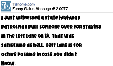 X says I just witnessed a state highway patrolman pull someone over for staying in the left lane on 23. That was satisfying as hell. Left lane is for active passing in case you didn’t know.