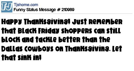 X is Happy Thanksgiving! Just remember that Black Friday shoppers can still block and tackle better than the Dallas Cowboys on Thanksgiving. Let that sink in!