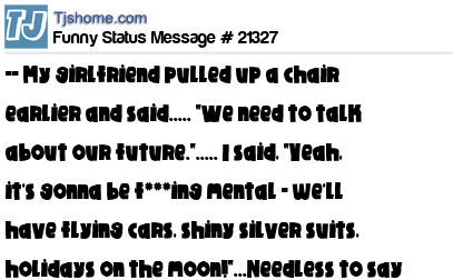 X -- My girlfriend pulled up a chair earlier and said..... "We need to talk about our future."..... I said, "Yeah, it's gonna be f***ing mental - we'll have flying cars, shiny silver suits, holidays on the moon!"...Needless to say - I'm now f***ing single !