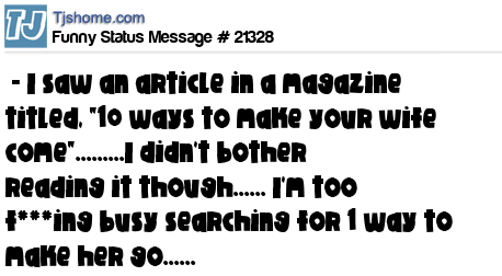 X - I saw an article in a magazine titled, "10 ways to make your wife come".........I didn't bother reading it though...... I'm too f***ing busy searching for 1 way to make her go......