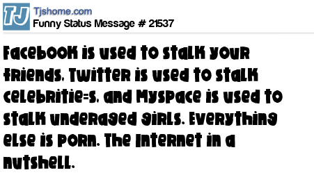 X is Facebook is used to stalk your friends, Twitter is used to stalk celebritie=s, and Myspace is used to stalk underaged girls. Everything else is porn. The Internet in a nutshell.