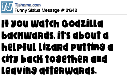 X says If you watch Godzilla backwards, it's about a helpful lizard putting a city back together and leaving afterwards.