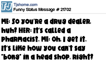 X ME: So you're a drug dealer, huh? HER: It's called a pharmacist. ME: Oh, I get it. It's like how you can't say "bong" in a head shop, right?