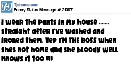 X says I wear the pants in my house ....... straight after I've washed and ironed them. Yep I'M THE BOSS when shes not home and she bloody well knows it too !!!