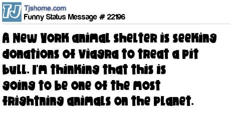 X says A New York animal shelter is seeking donations of Viagra to treat a pit bull. I'm thinking that this is going to be one of the most frightning animals on the planet.