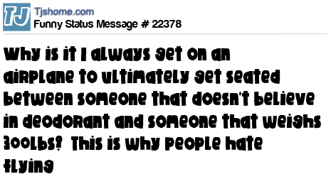 X is Why is it I always get on an airplane to ultimately get seated between someone that doesn't believe in deodorant and someone that weighs 300lbs? This is why people hate flying