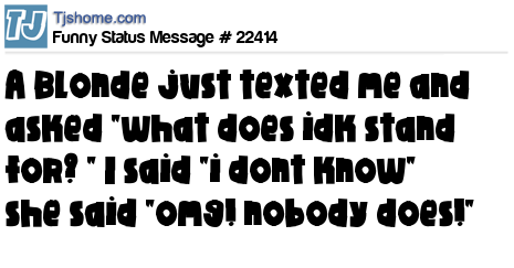 X says a Blonde just texted me and asked "what does idk stand for? " I said "i dont know" she said "omg! nobody does!"