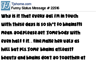 X is Why is it that every gal i'm in touch with these days is so sh*t fo brains??i mean, god,please,get 'Some'body with even half f it. . fine,make her ugly as hell but pls,'Some' brains atleast? beauty and brains don't go together at all,I know now. . . :/