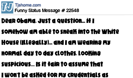 X is Dear Obama, Just a question… if I somehow am able to sneak into the White House (Illegally)… and I am wearing my normal day to day clothes, looking suspicious... Is it fair to assume that I won't be asked for my crudentials as long as I'm good?