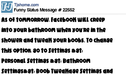 X is As of tommorrow, Facebook will creep into your bathroom when you're in the shower and tweak your boobs. To change this option, go to Settings > Personal Settings > Bathroom Settings> Boob Tweakage Settings and uncheck the Shenanigans box.