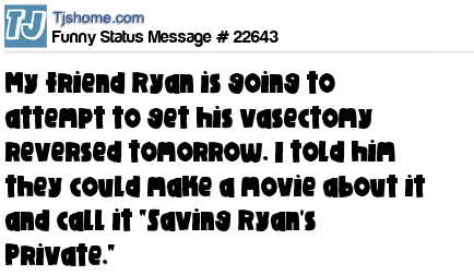 - # 206704 My friend Ryan is getting his vasectomy reversed tomorrow...I'm planning to make a movie about it and call it Saving Ryan's Private
