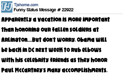 X is Apparently a vacation is more important than honoring our fallen soldiers at Arlington....But don't worry, Obama will be back in DC next week to rub elbows with his celebrity friends as they honor Paul McCartney's many accomplishments. Jerk!