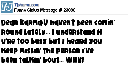 X says Dear Karma:U haven't been comin' round lately... I understand if u're too busy but I heard you keep missin' the person i've been talkin' bout... WHY?