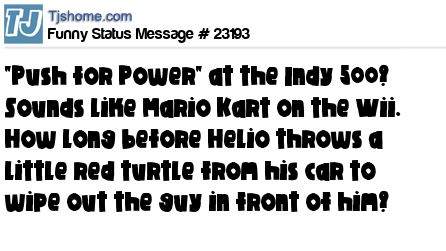 X says "Push for Power" at the Indy 500? Sounds like Mario Kart on the Wii. How long before Helio throws a little red turtle from his car to wipe out the guy in front of him?