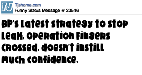 - # 23138 Why hasn't BP used my solution yet to stop that oil leak? Simple AND brilliant...contact Tampax, have the worlds largest tampon made. Stick it in the hole....TADA, no more leak...AND the BP execs will be able to go horseback riding afterwards.