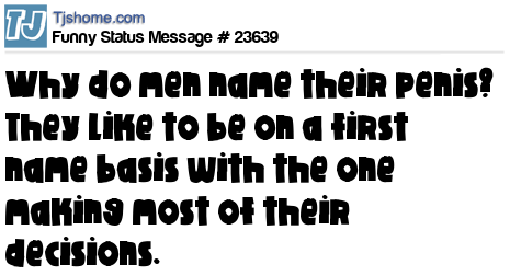 X  Why do men name their penis? They like to be on a first name basis with the one making most of their decisions.