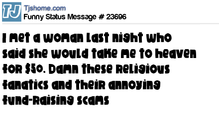 X  I met a woman last night who said she would take me to heaven for $50. Damn these religious fanatics and their annoying fund-raising scams