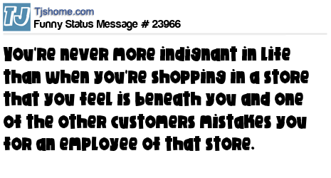 X You're never more indignant in life than when you're shopping in a store that you feel is beneath you and one of the other customers mistakes you for an employee of that store.