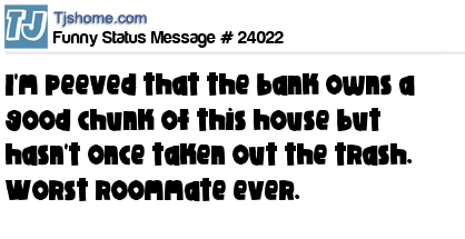 X I'm peeved that the bank owns a good chunk of this house but hasn't once taken out the trash. Worst roommate ever.