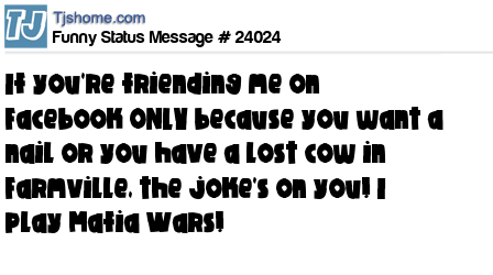 X If you're friending me on Facebook ONLY because you want a nail or you have a lost cow in Farmville, the joke's on you! I play Mafia Wars!