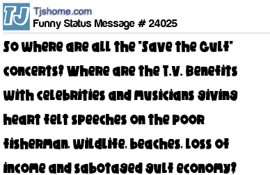 - # 23874 So where are all the "Save the Gulf" concerts? We can send bjillions to Haiti but forget the working folks in the Gulf, eh?