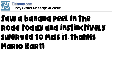 - # 37400 While driving yesterday, I saw a banana peel in the road and instinctively swerved to avoid it......thanks a lot Mario Kart.