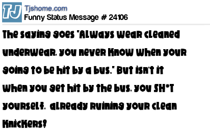 X The saying goes "Always wear cleaned underwear, you never know when your going to be hit by a bus." But isn't it when you get hit by the bus, you SH*T yourself, already ruining your clean knickers?