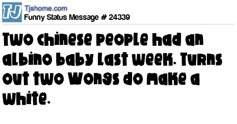 X Two chinese people had an albino baby last week. Turns out two Wongs do make a white.