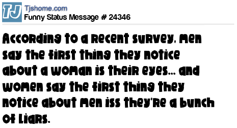 X According to a recent survey, men say the first thing they notice about a woman is their eyes... and women say the first thing they notice about men iss they're a bunch of liars.