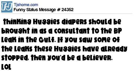 X is thinking Huggies diapers should be brought in as a consultant to the BP leak in the Gulf. If you saw some of the leaks these Huggies have already stopped, then you'd be a believer. LOL