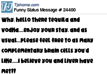X why, hello there tequila and vodka....enjoy your stay, and as usual...please feel free to as many complementary brain cells you'd like.....i believe you and liver have met??