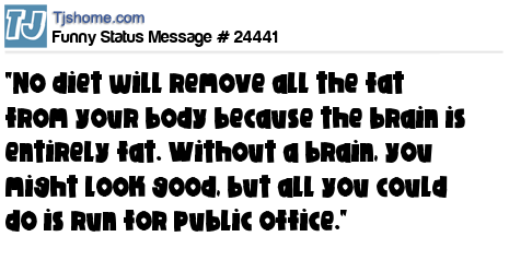 - # 62105 "No diet will remove all the fat from your body, because the brain is entirely fat. Without a brain, you might look good, but all you could do is run for public office."