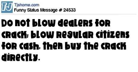 - # 33413 If my MTV carreer doesn't work out I think i'm goin to buy a gun.. and sell crack. I'll be a friendly crack dealer though, nothing too formal. I'll just be like 'what's up, want some crack?'