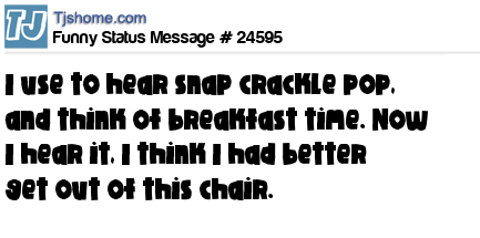 - # 65852 You know your getting older when...At the breakfast table you hear snap, crackle, pop and you're not eating cereal.