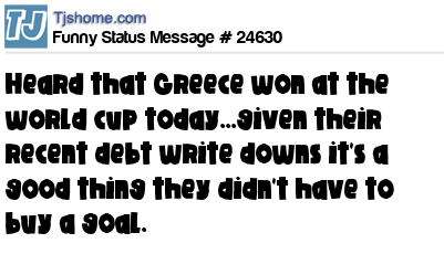 X heard that Greece won at the world cup today...given their recent debt write downs it's a good thing they didn't have to buy a goal.