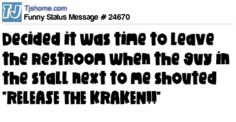 X is decided it was time to leave the restroom when the guy in the stall next to me shouted "RELEASE THE KRAKEN!!"