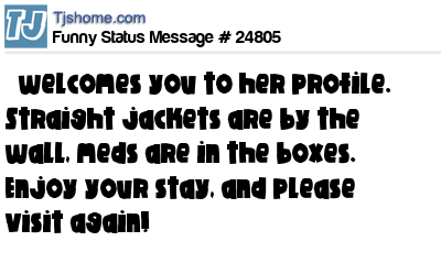 - # 75052 Welcome to my Facebook wall. Straight jackets are on your left, meds are on the table, and if you hurry, you can still get a seat in group therapy . . . have fun!