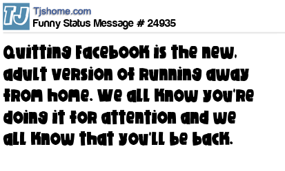 - # 134852 Quitting Facebook is the adult way of running away from home. We all know you're doing just to get attention and we all know you will be back.