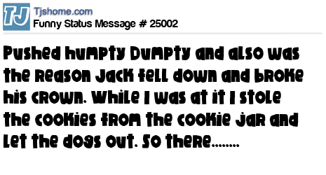 - # 35937 All right, let's solve this once and for all. It was ME who pushed Humpty Dumpty, I also took Little Bo Peeps sheep for ransom, I was the one who let the dogs out and stole the cookies from the cookie jar. So there!!