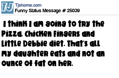X says I think I am going to try the Pizza, Chicken Fingers and Little Debbie diet. That's all my daughter eats and not an ounce of fat on her.