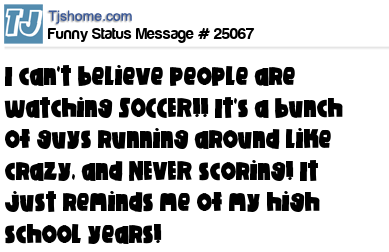 X is I can't believe people are watching SOCCER!! It's a bunch of guys running around like crazy, and NEVER scoring! It just reminds me of my high school years!