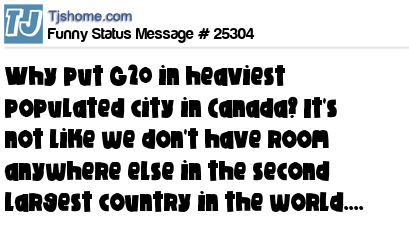 X Why put G20 in heaviest populated city in Canada? It's not like we don't have room anywhere else in the second largest country in the world....