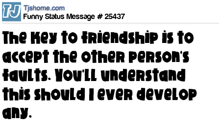X The key to friendship is to accept the other person's faults. You'll understand this should I ever develop any.
