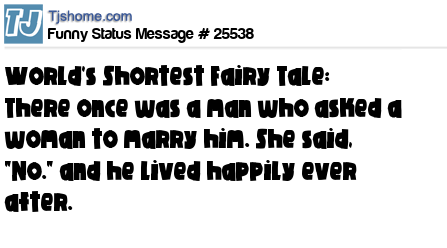 - # 25221 **shortest fairly tale**-->once upon a time, a guy asked a girl "will you marry me?" The girl said "NO!" The guy lived happily ever after..